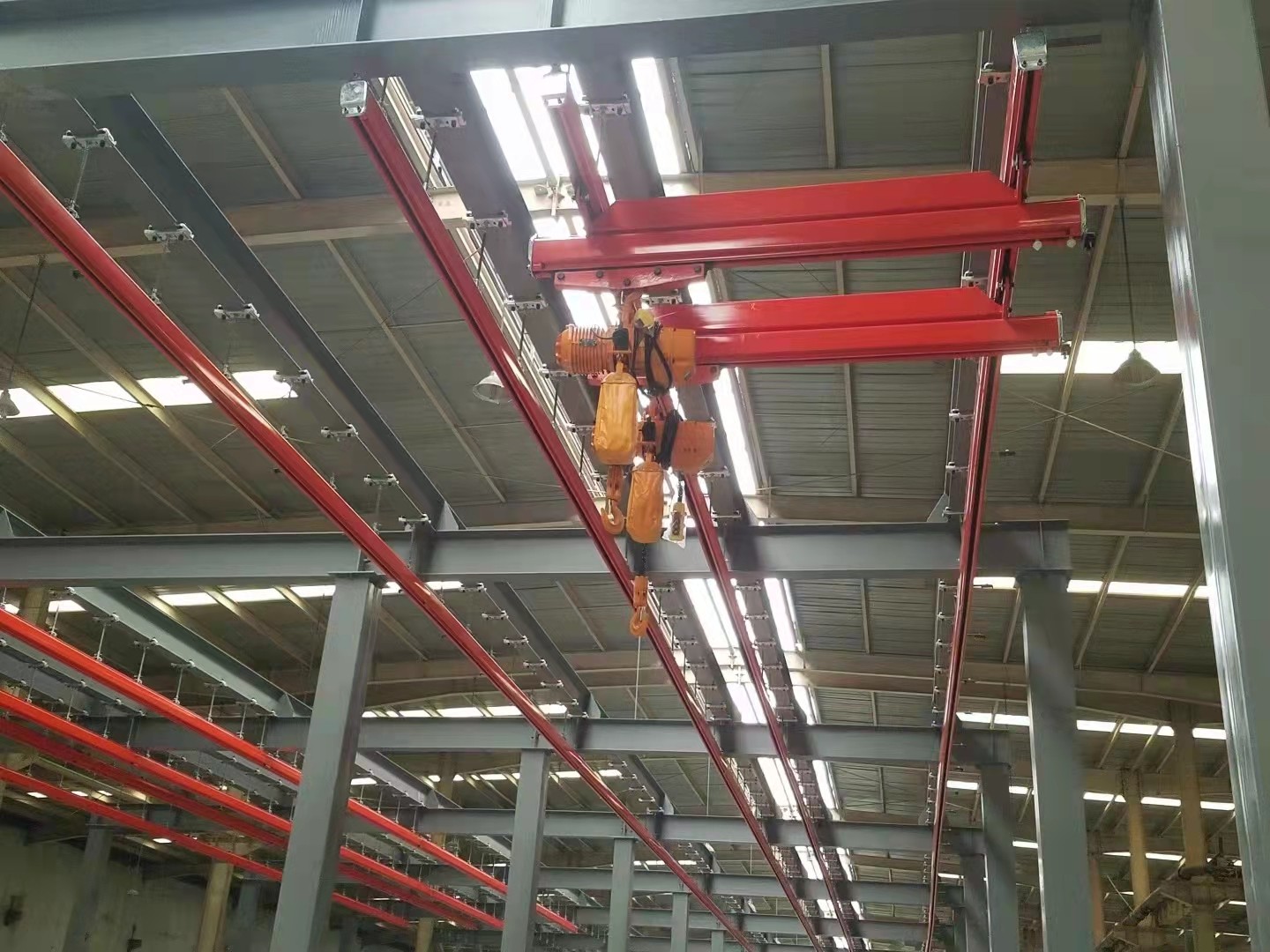 KBK起重機標準組件。由懸掛裝置、軌道、道岔、行走小車、電動葫蘆、移動供電裝置(滑線)以及控制裝置等組件組合而成,起升裝置主要采用環鏈電動葫蘆,也可吊掛一些機械手或焊槍之類,作為工具滑軌使用,起重量一般不超2000kg。