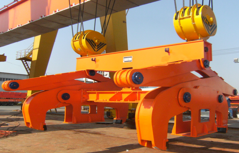 7、 雙吊點夾鉗吊具靠自重鎖緊,開閉器定位,自動實現鉗口的開閉工作,不消耗電能,有利于環保。結構簡單,制造方便,價格便宜,外形尺寸小,自重輕。