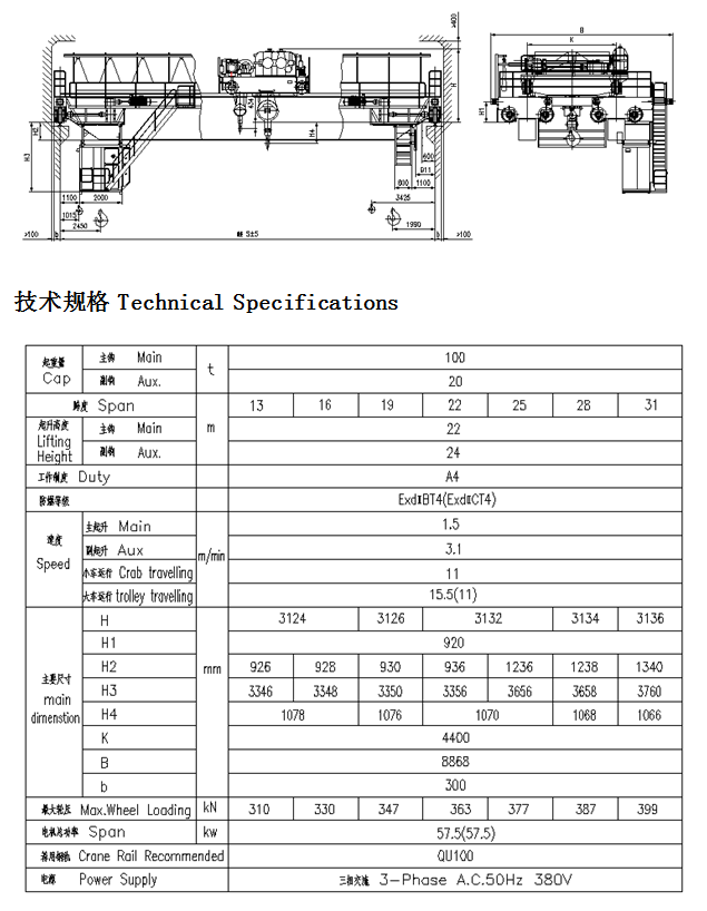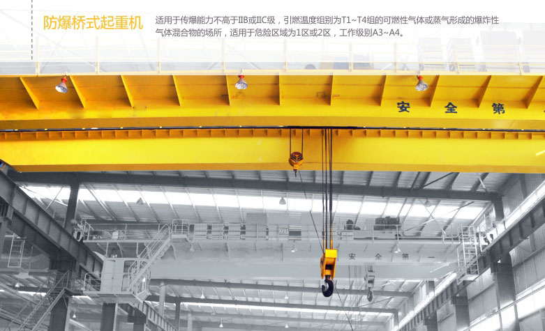 1、 QB型防爆吊鉤橋式起重機所有電機、電器防爆性能符合GB3836.2-2000《爆炸性氣體環境用防爆電氣設備第2部分:隔爆型“d”》,整機性能符合JB/T5897-2006《防爆橋式起重機》標準之規定,經國家指定的防爆產品檢驗單位檢驗合同,取得了《防爆合格證》。防爆標志分別為ExdⅡBT4、ExdⅡCT4。