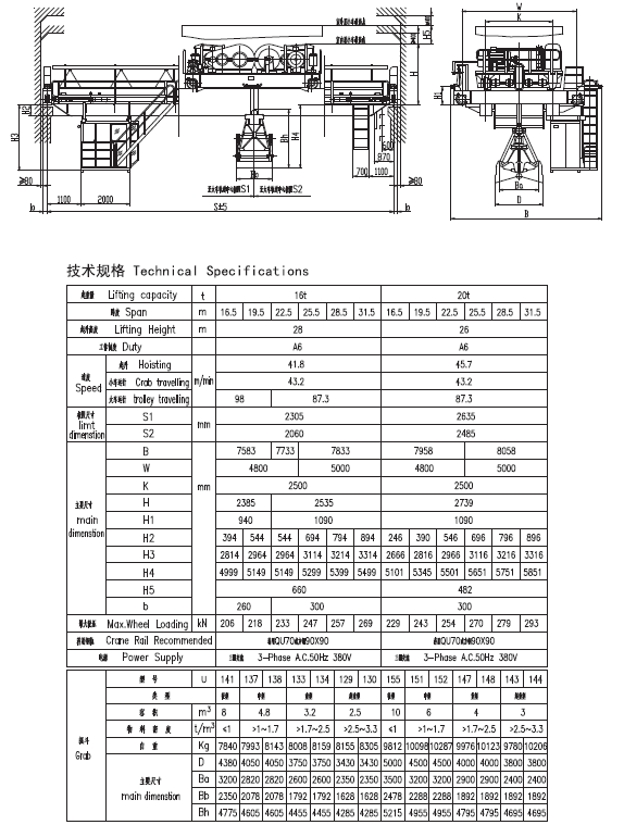 6、 取物裝置為雙卷筒的四繩抓斗,結構簡單,工作可靠。抓斗可在任意高度張開和閉合。