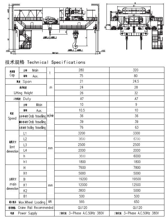 4、 另外,我公司的鑄造起重機可提供以下功能,供用戶選配:可旋轉吊具;龍門鉤鉤距可變;載荷的稱重及顯示。
